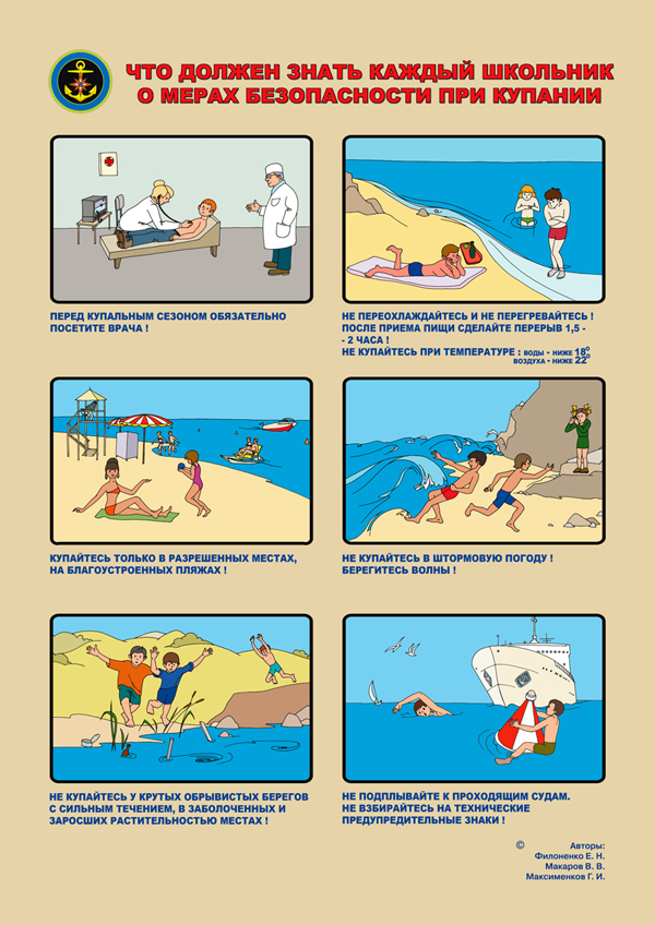 Всегда хорошо проверяйте дно и следите за купающимися детьми. Дети должны купаться у самого берега. Никогда не купайтесь в заболоченных местах;
