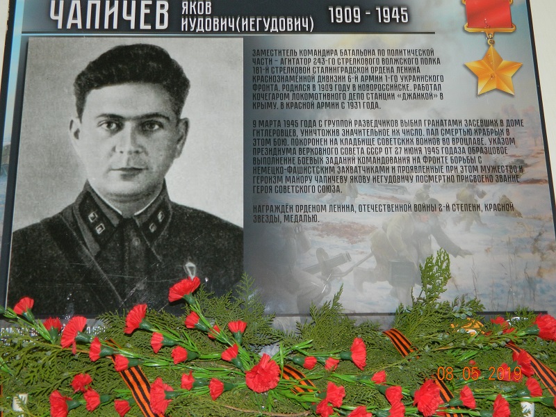 Чапичев Яков Иудович (Иегудович) — заместитель командира батальона по политической части – агитатор 243-го стрелкового Волжского полка 181-й стрелковой Сталинградской ордена Ленина Краснознамённой дивизии 6-й армии 1-го Украинского фронта, майор.